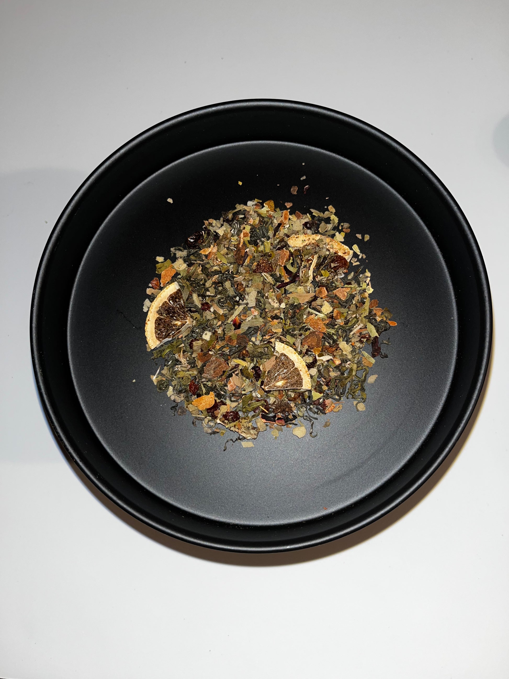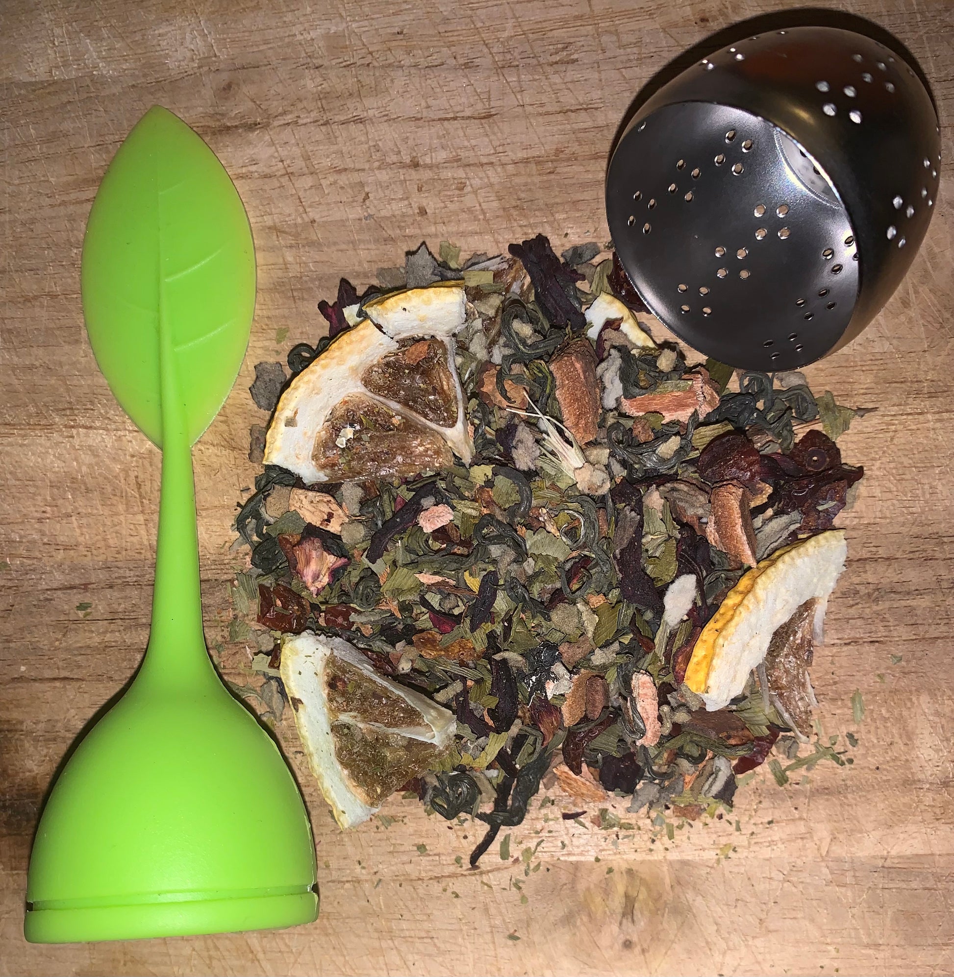 Components: Himalayan green tea, dried strawberry & kiwi, dried lemon, gingko leaf, mullein leaf, wild cherry bark